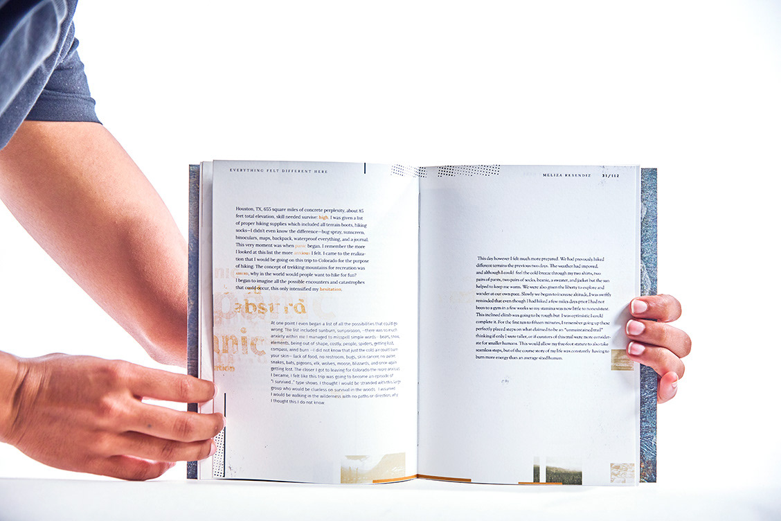 Every year the graduating University of Houston senior graphic design class takes a trip to a location of their choice. Everything Felt Different Here is product of 2019’s trip to Eastes Park , Colorado. This surreal experience served as visual inspiration for this book, the rugged out doors influenced the use of handmade elements, while the openness of Rockies inspire the use of ample negative space throughout the book. A group of 26 designers shared one same trip experience but everyone's individual adventure was unique and one of a kind.
